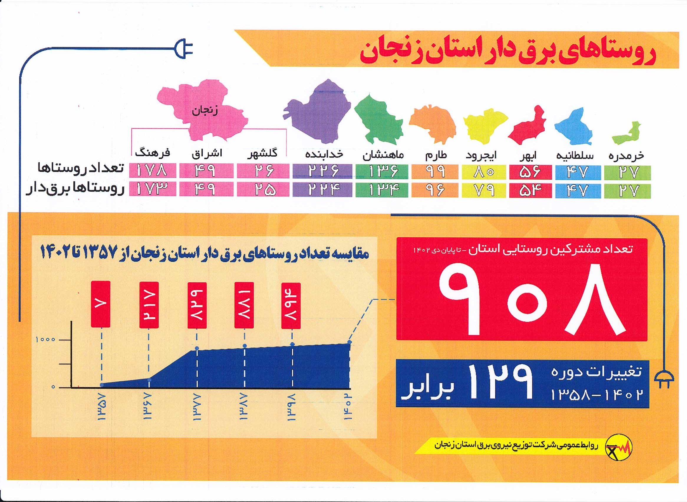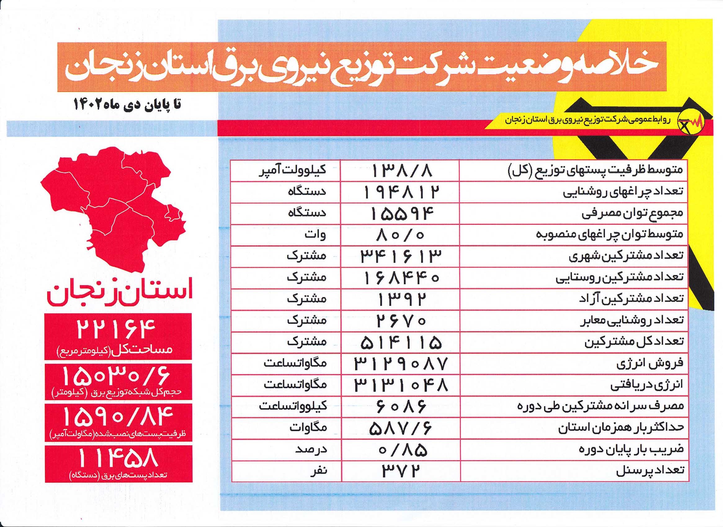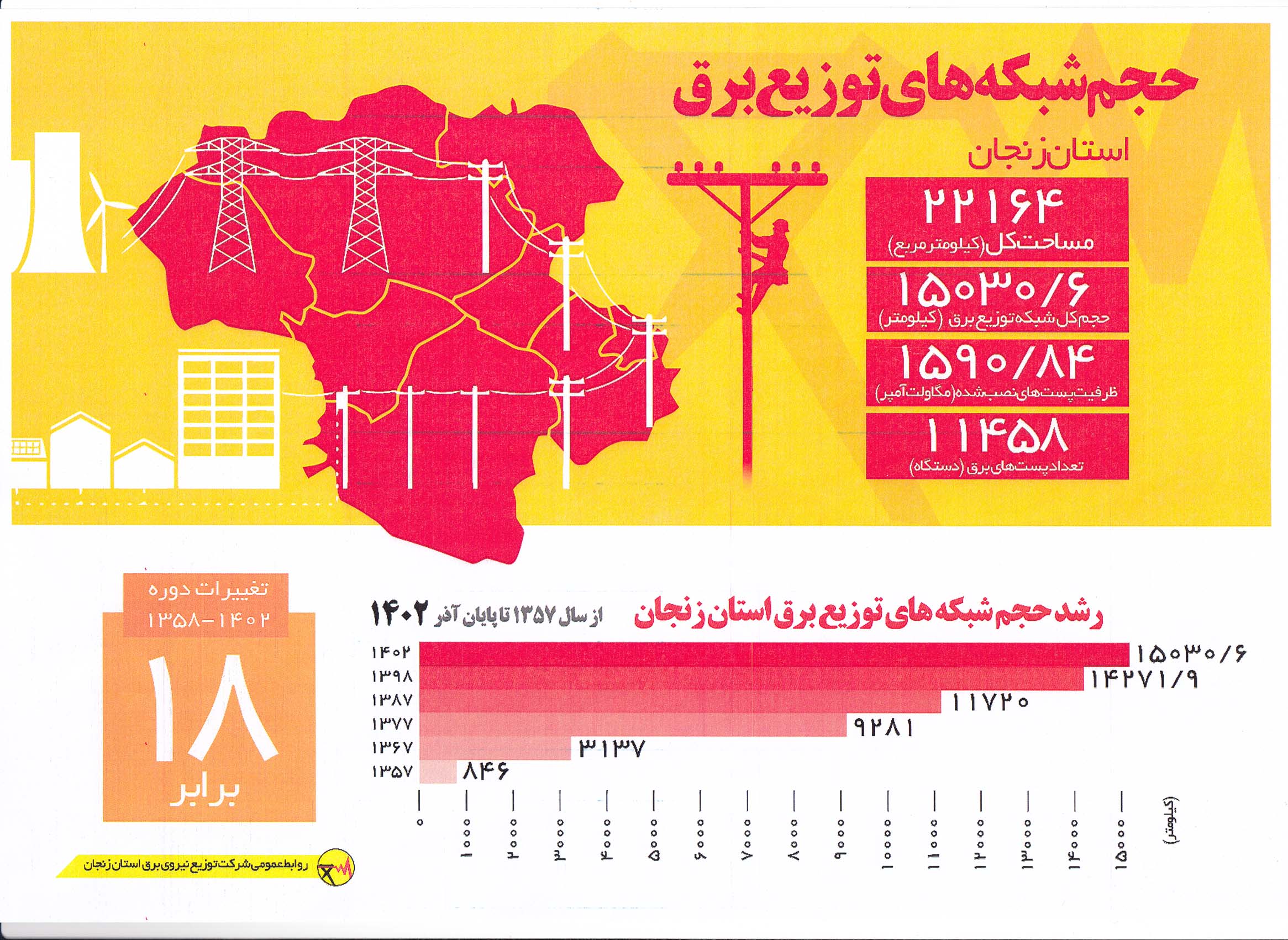 مدیرعامل شرکت توزیع نیروی برق استان زنجان در این مراسم، ضمن تبریک ایام دهه فجر حجم شبکه توزیع برق استان را بیش از ١۵هزار کیلومتر عنوان کرد و افزود: این میزان پس از پیروزی انقلاب اسلامی تاکنون بیش از ١٨ برابر رشد داشته و انرژی برق را برای بیش از ۵٠٠هزار مشترک توزیع می کند.